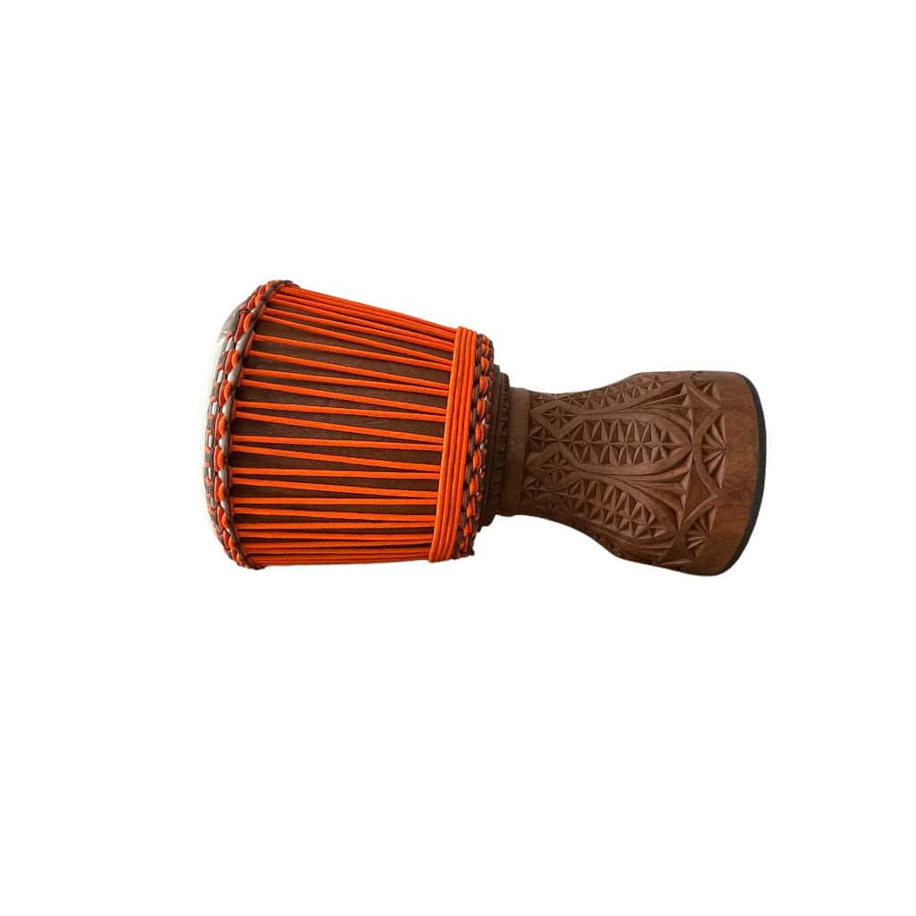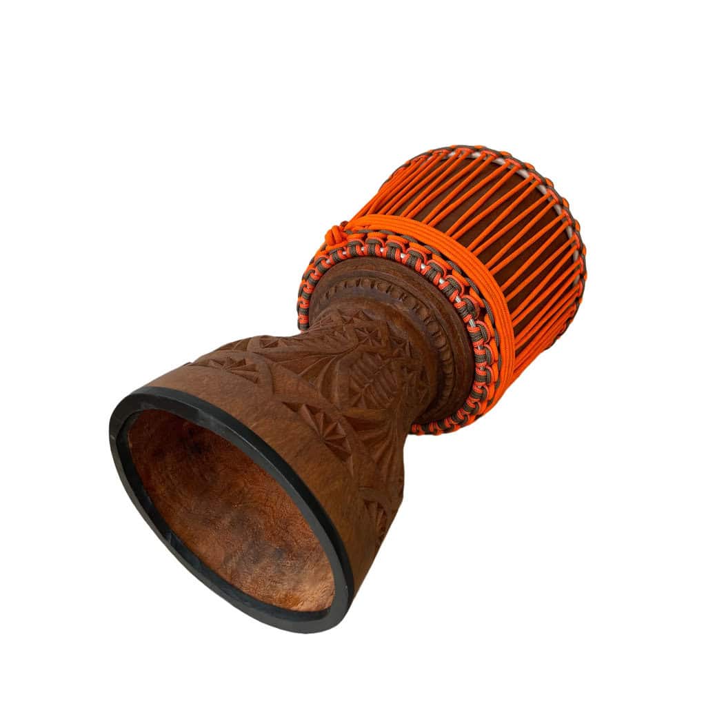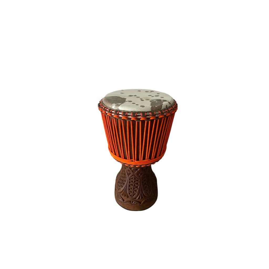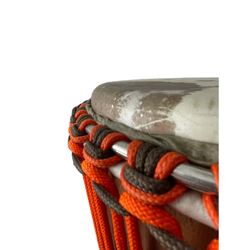 Djembe precisoso en madera de Dougura de Mali. Piel mediana de vaca con manchas, anillos de acero inoxidable, pie de goma y cuerdas color naranja y marrón.