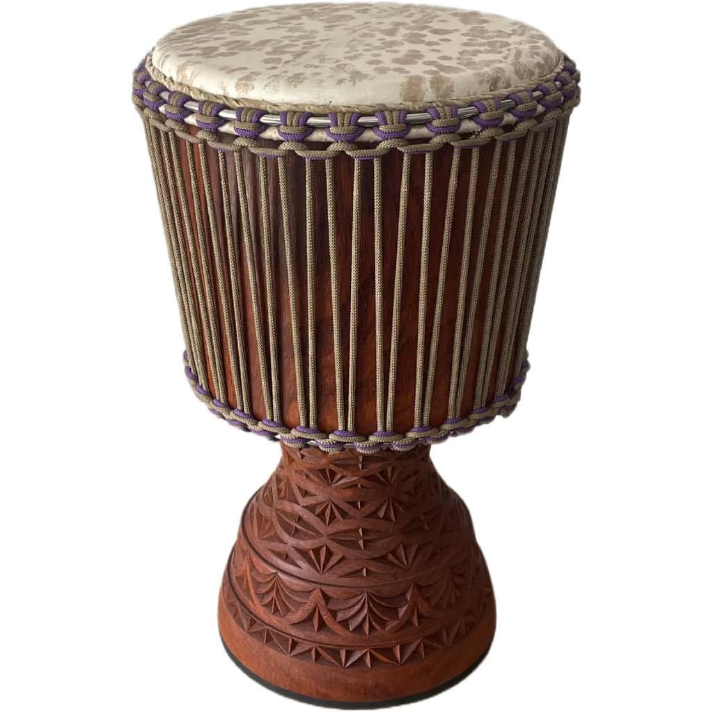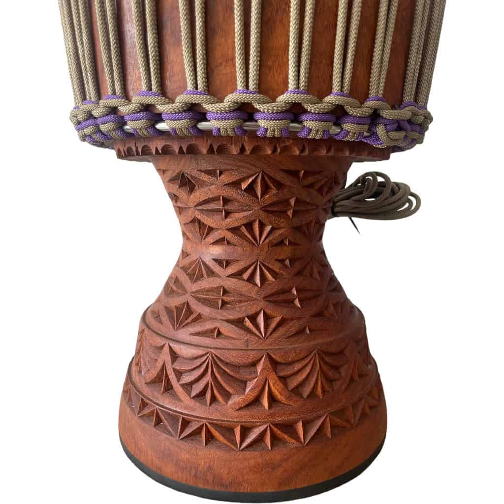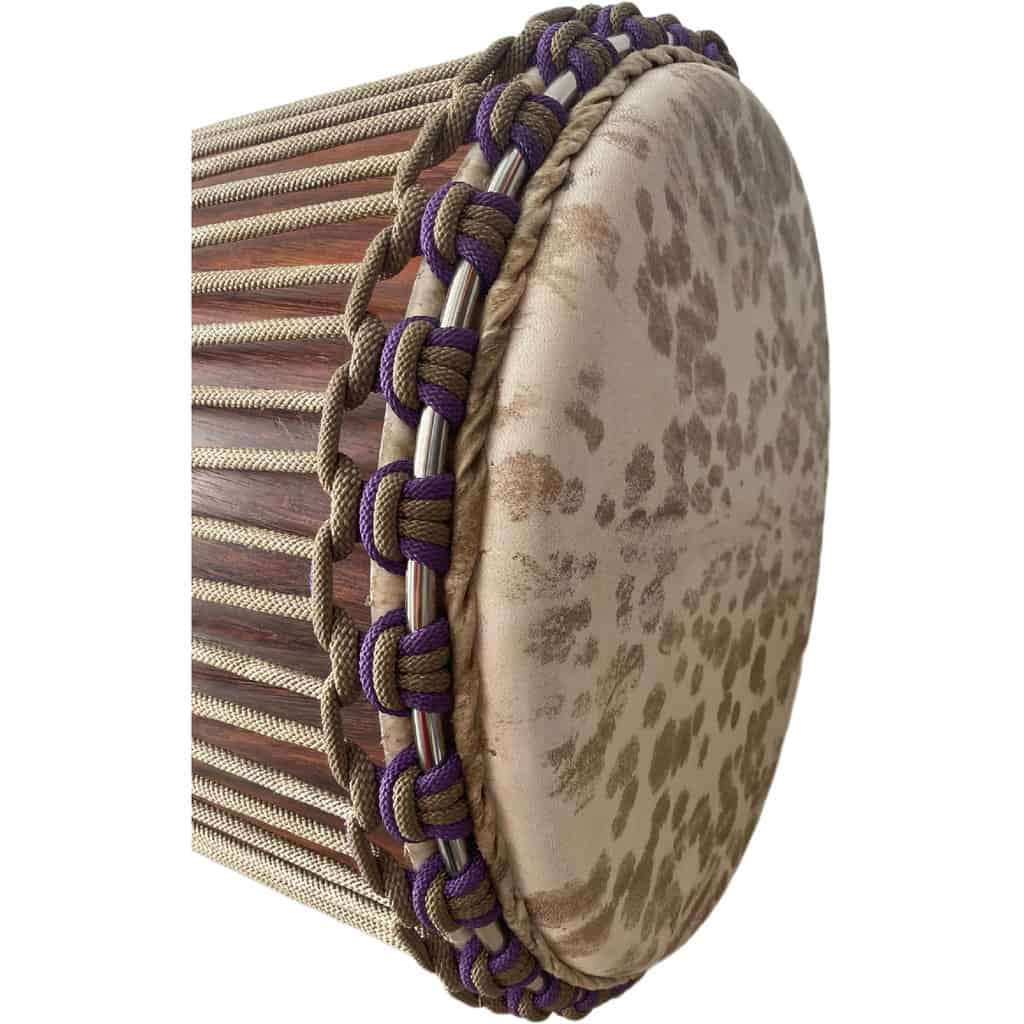 Djembe de grandes dimensiones en madera de Lenke de Mali. El pie mide 30 cm! Piel de cabra gruesa manchada, anillos de acero inoxidable, pie de goma, cuerdas en beige y violeta.