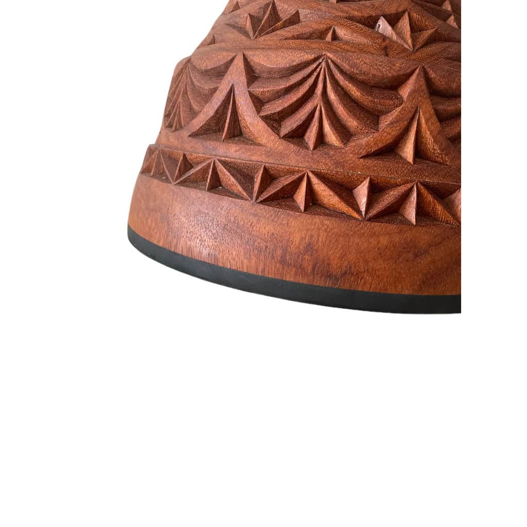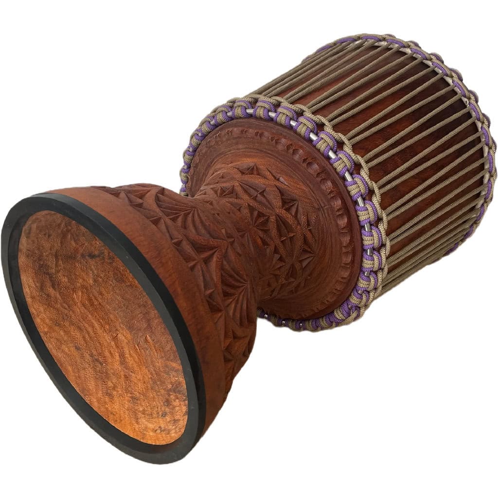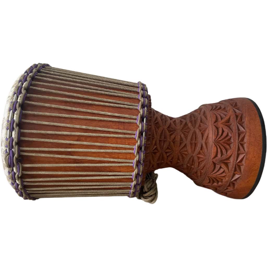 Djembe de grandes dimensiones en madera de Lenke de Mali. El pie mide 30 cm! Piel de cabra gruesa manchada, anillos de acero inoxidable, pie de goma, cuerdas en beige y violeta.